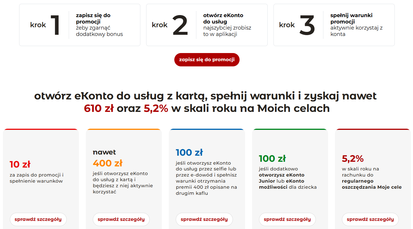 - Szczegóły dotyczące premii Zyskaj nawet 720 zł i 5,1% na oszczędnościach:- 20 zł – za samo zapisanie się do promocji oraz spełnienie podstawowych warunków aktywności określonych w regulaminie - do 500 zł – za otwarcie eKonta do usług wraz z kartą oraz aktywne korzystanie z konta (szczegółowe warunki wpływów i transakcji kartą w kolejnych miesiącach) - 100 zł – bonus jednorazowy za otwarcie konta metodą "na selfie" lub przy użyciu e-dowodu (pod warunkiem spełnienia pozostałych wymogów aktywności) - 100 zł – za otwarcie konta dla dziecka (eKonto Junior lub eKonto możliwości) w okresie trwania promocji
